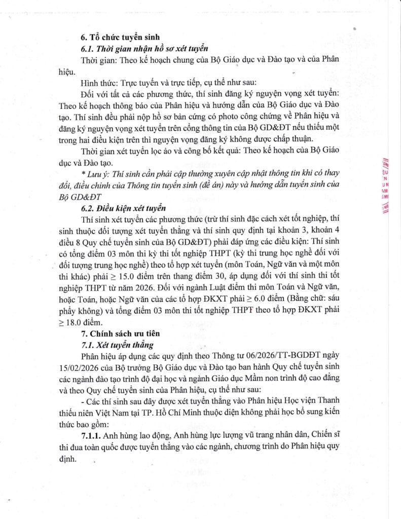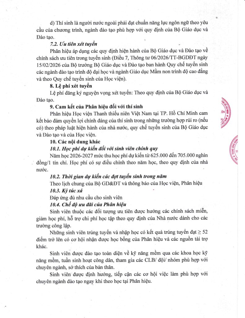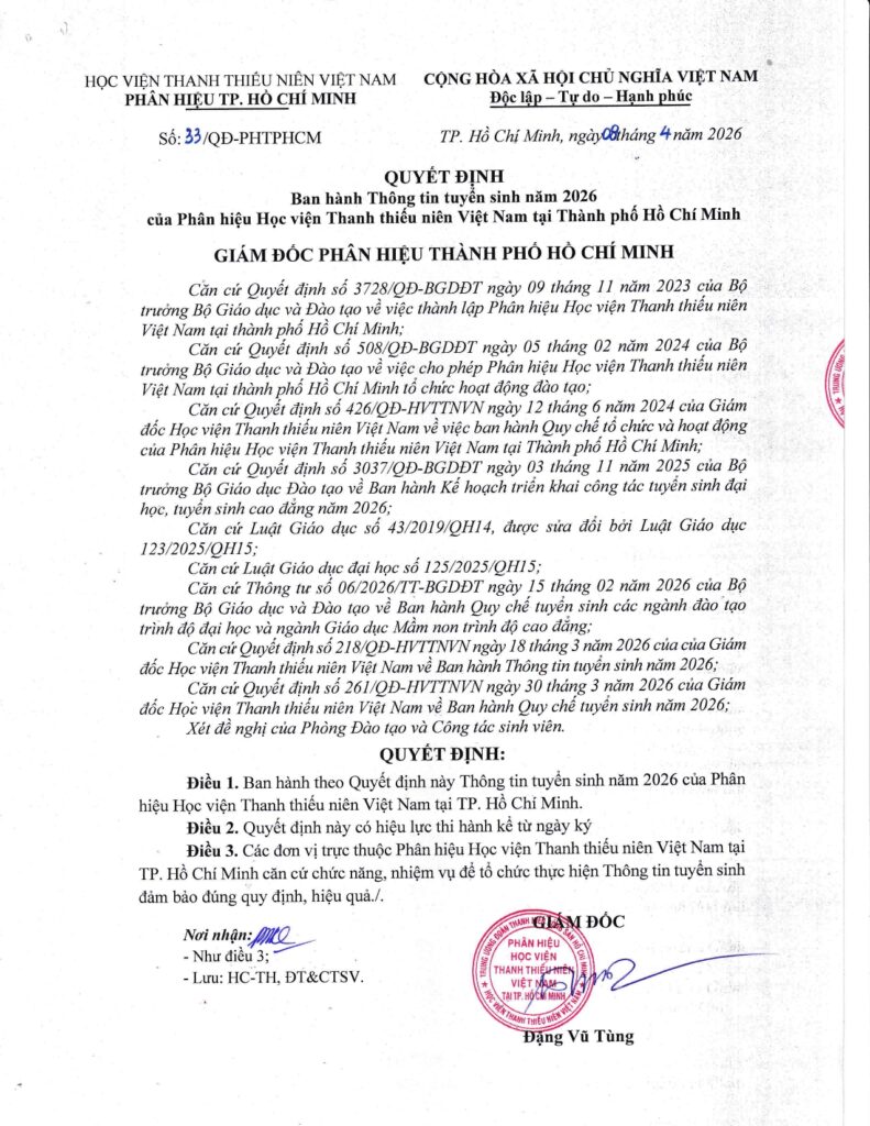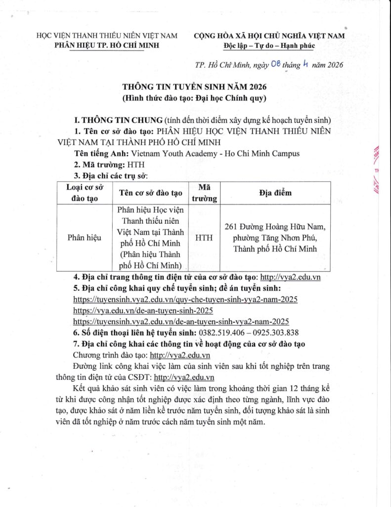TIN TỨC, Đăng ký tuyển sinh, Thông Báo, Tuyển sinh, Tuyển Sinh Đại Học Chính Quy THÔNG TIN TUYỂN SINH NĂM 2026 – PHÂN HIỆU HỌC VIỆN THANH THIẾU NIÊN VIỆT NAM TẠI TP. HỒ CHÍ MINH Posted on Tháng 4 8, 2026Tháng 4 10, 2026| by admin| 68 lượt xem| admin TUYỂN SINH HỆ ĐẠI HỌC CHÍNH QUY NĂM 2026 – PHÂN HIỆU HỌC VIỆN THANH THIẾU NIÊN VIỆT NAM TẠI TP. HỒ CHÍ MINH Thông báo về việc nghỉ Lễ Giổ tổ Hùng Vương (10/03/2026 âm lịch), giải phóng miền Nam và Quốc tế lao động (30/04 và 01/05) năm 2026 đối với giảng viên, sinh viên