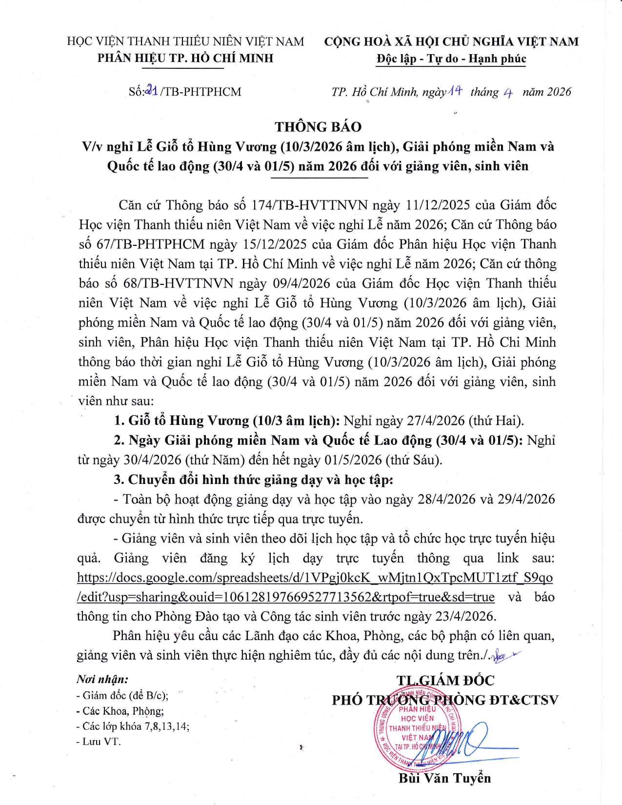 ĐÀO TẠO, ĐẠI HỌC CHÍNH QUY, LỊCH CÔNG TÁC, LỊCH HỌC TẬP, Sự kiện – hoạt động, TIN TỨC Thông báo về việc nghỉ Lễ Giổ tổ Hùng Vương (10/03/2026 âm lịch), giải phóng miền Nam và Quốc tế lao động (30/04 và 01/05) năm 2026 đối với giảng viên, sinh viên Posted on Tháng 4 14, 2026Tháng 4 14, 2026| by admin| 21 lượt xem| 14 Th4 admin THÔNG TIN TUYỂN SINH NĂM 2026 – PHÂN HIỆU HỌC VIỆN THANH THIẾU NIÊN VIỆT NAM TẠI TP. HỒ CHÍ MINH